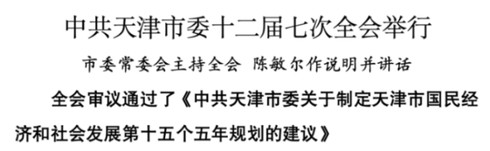 全會由市委常委會主持。市委書記陳敏爾作了講話。全會審議通過了《中共天津市委關(guān)于制定天津市國民經(jīng)濟和社會發(fā)展第十五個五年規(guī)劃的建議》。陳敏爾就《建議(討論稿)》向全會作了說明。